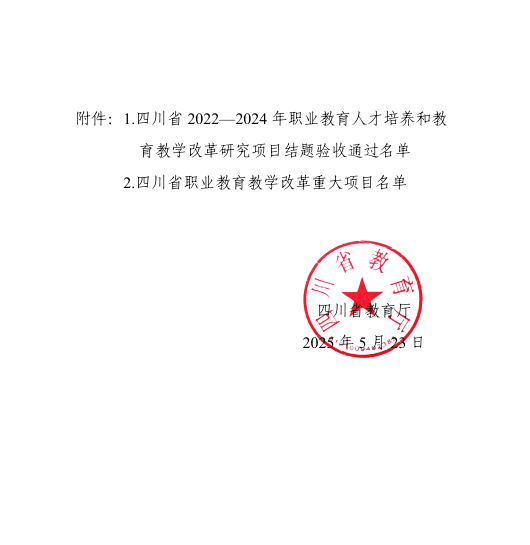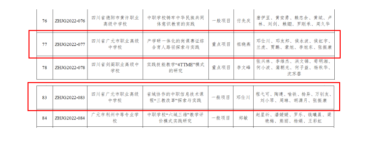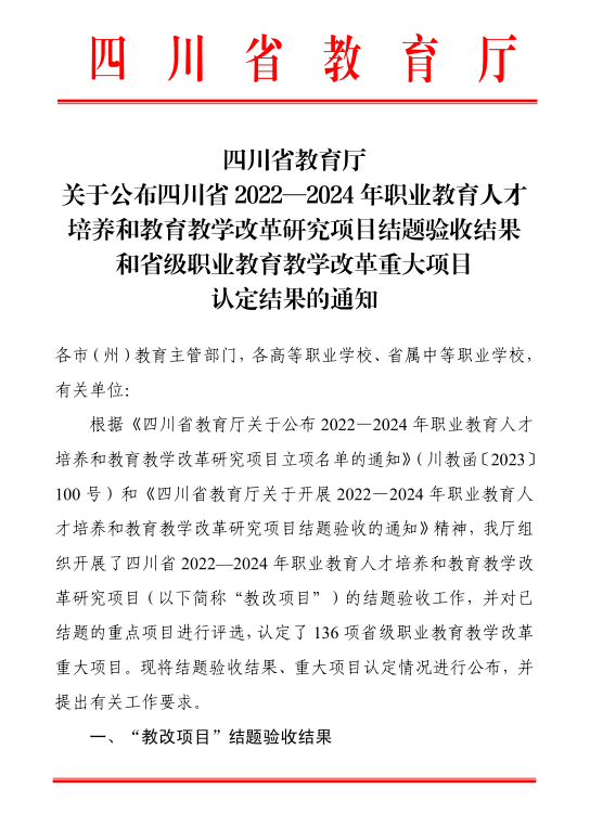 近日,在四川省教育厅公布的职业教育教改项目结题名单中,我校重点项目《产学研一体化的岗课赛证综合育人路径探索与实践》、一般项目《省域协作的中职信息技术课程“三教改革”探索和实践》两项课题顺利通过验收。其中,《产学研一体化的岗课赛证综合育人路径探索与实践》被认定为省级职业教育教育教学重大改革项目。我校始终聚焦学生发展,以教育教学中的实际问题为导向,坚持问题即课题的研究思路,不断追求教科研成果的创新与突破。